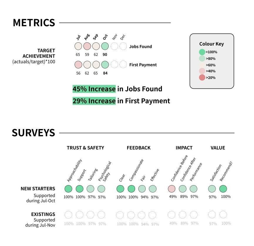 The results shown for new starters (supported July–October) and existing Employment Advisors (supported July–November - work in progress) come from anonymous post-coaching surveys. Advisors rated their experience across 4 key areas: